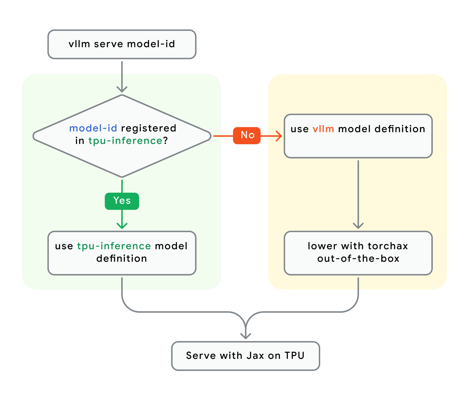 Takeaway #2: vLLM TPU will now default to running the TPU-optimized model code in tpu-inference if it exists, otherwise, it will fallback to the PyTorch model code from vLLM upstream (lowered using JAX via Torchax). For most users, this is an implementation detail.